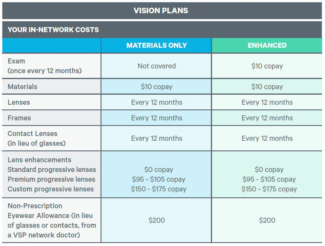You will have the choice of two vision plans through VSP – a Materials Only Plan and an Enhanced Plan. To search for providers in the VSP network, go to vsp.com. You will not receive an ID card from VSP. Your provider can find your coverage online.